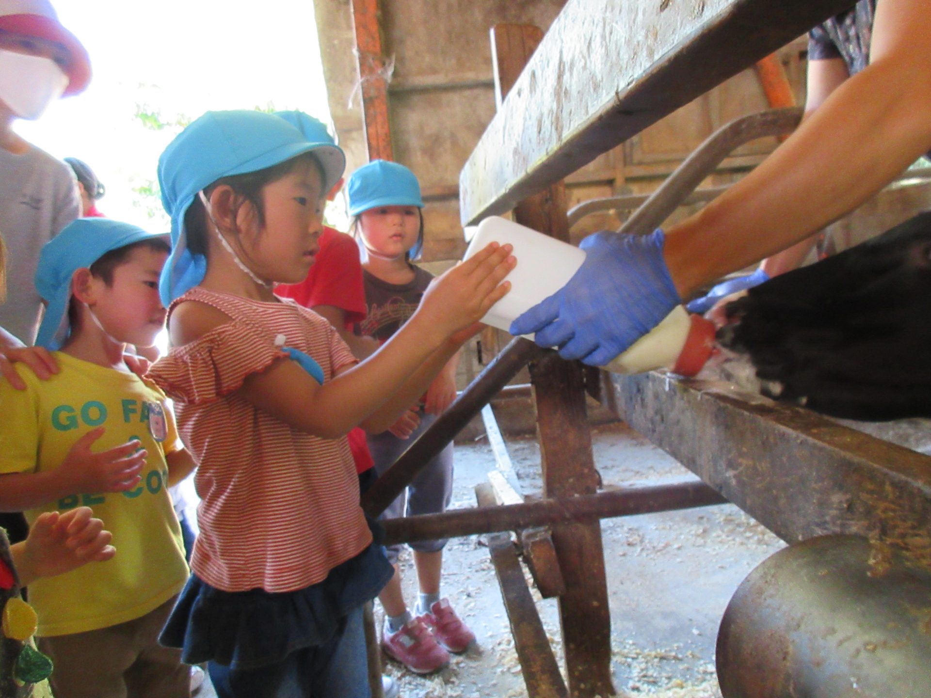 今年度は上山市にある蔵王マウンテンファーム山川牧場で酪農体験として、牛の乳しぼりやバター作り、野山散策をしました。実際に牛を目の前にすると何人かの子どもたちは『怖い・・・』と一言。約700㎏ある牛は迫力満点でしたが、牛を触ったりえさをあげたりしているうちにだんだんと身近な存在に変わっていきました。何よりも山川さんから命の大切さ、食べ物を大事に食べることの大切さを教えていただき、人として、大事な学びをして園に戻りました。