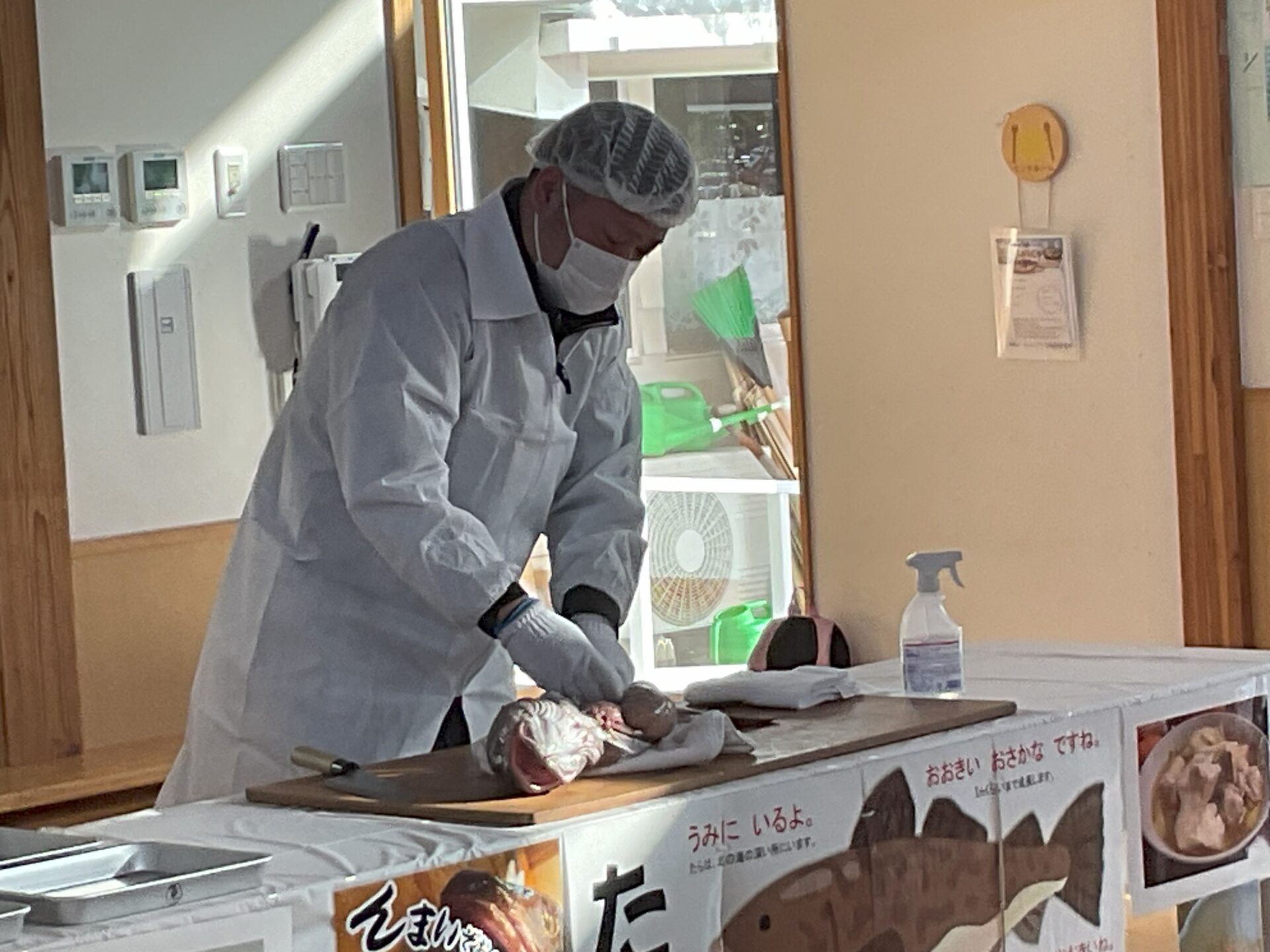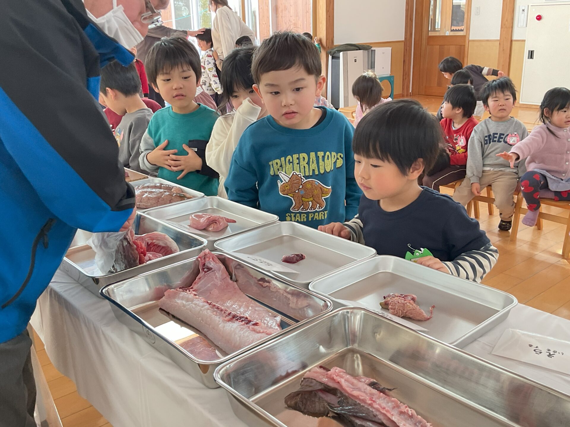 1/27(火)は寒だら汁の日でした。山形丸魚さんのご協力をいただき、メスの寒だらを子どもたちの目の前でさばいていただきました。心臓や肝臓、腸、骨、頭…それぞれの部分を実際に見た子どもたちは、寒だらに興味津々。海の底に住んでいて、あごのひげで餌を探すことや、お腹いっぱい(たらふく)食べることから、”たら”という名前になったことなどを知った子どもたちです。目の前で見た”たら”は、おいしい寒だら汁にして給食で頂きました。大切な命をいただいて元気に過ごしている私たちです。いろいろなことに感謝できる子どもたちに育ってほしいと思います。